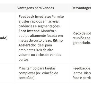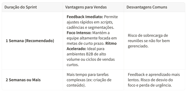 Embora o Scrum tradicional sugira Sprints de 2 a 4 semanas, a natureza acelerada do ciclo de vendas e a necessidade de feedback imediato tornam o ciclo de 1 semana ideal para a área comercial.